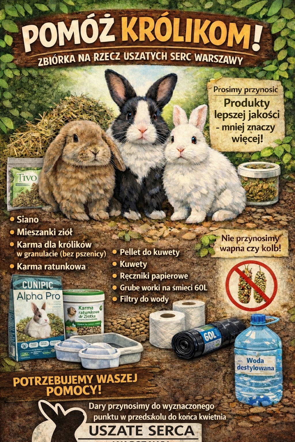 Zapraszamy do wzięcia udziału w zbiórce na rzecz warszawskich królików. Zbieramy: siano, mieszanki ziół, karmę dla królików w granulacie, karmę ratunkową, pellet do kuwety, kuwety, ręczniki papierowe, grube worki na śmieci, filtry do wody. Za każdą pomoc - dziękujemy.