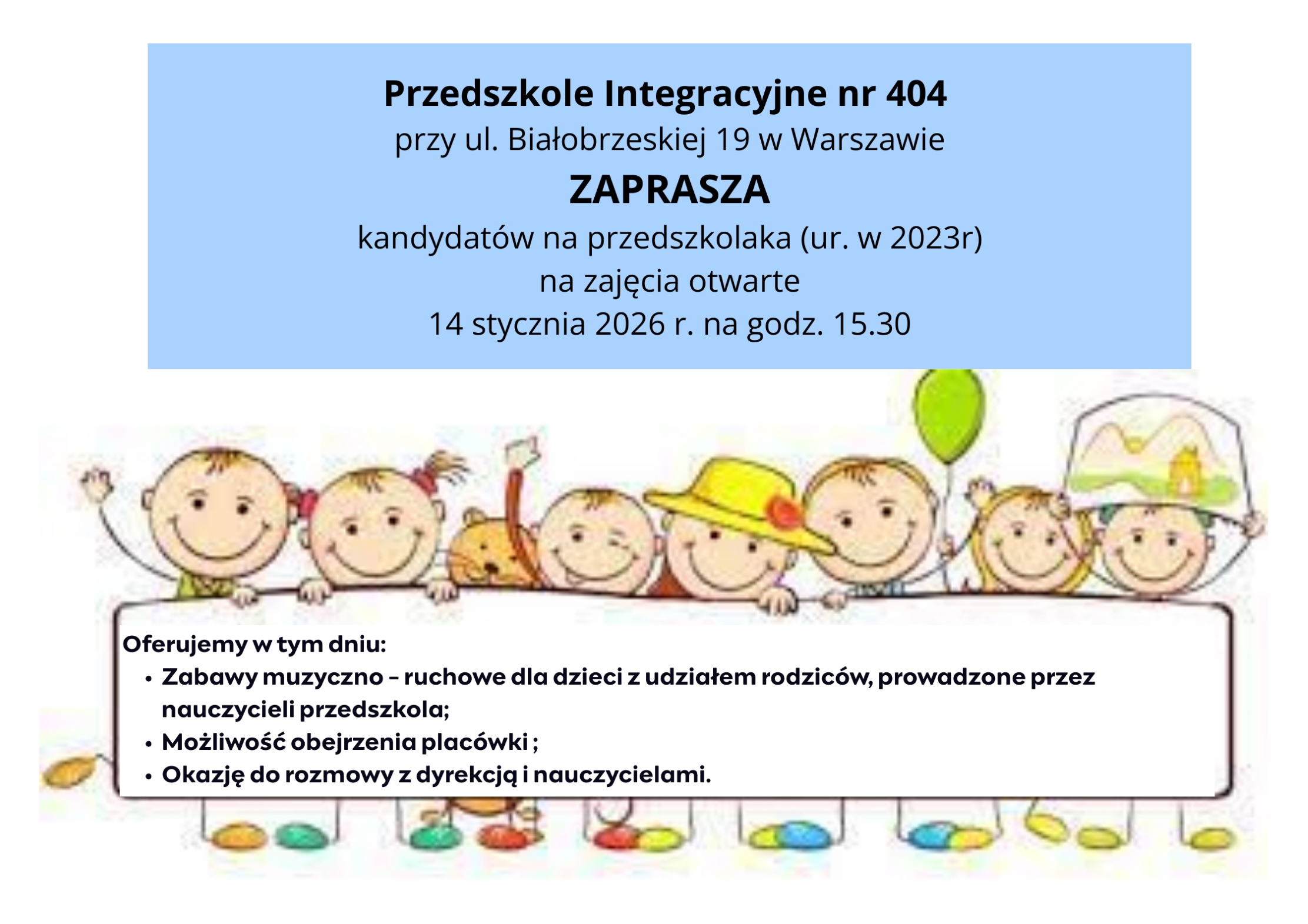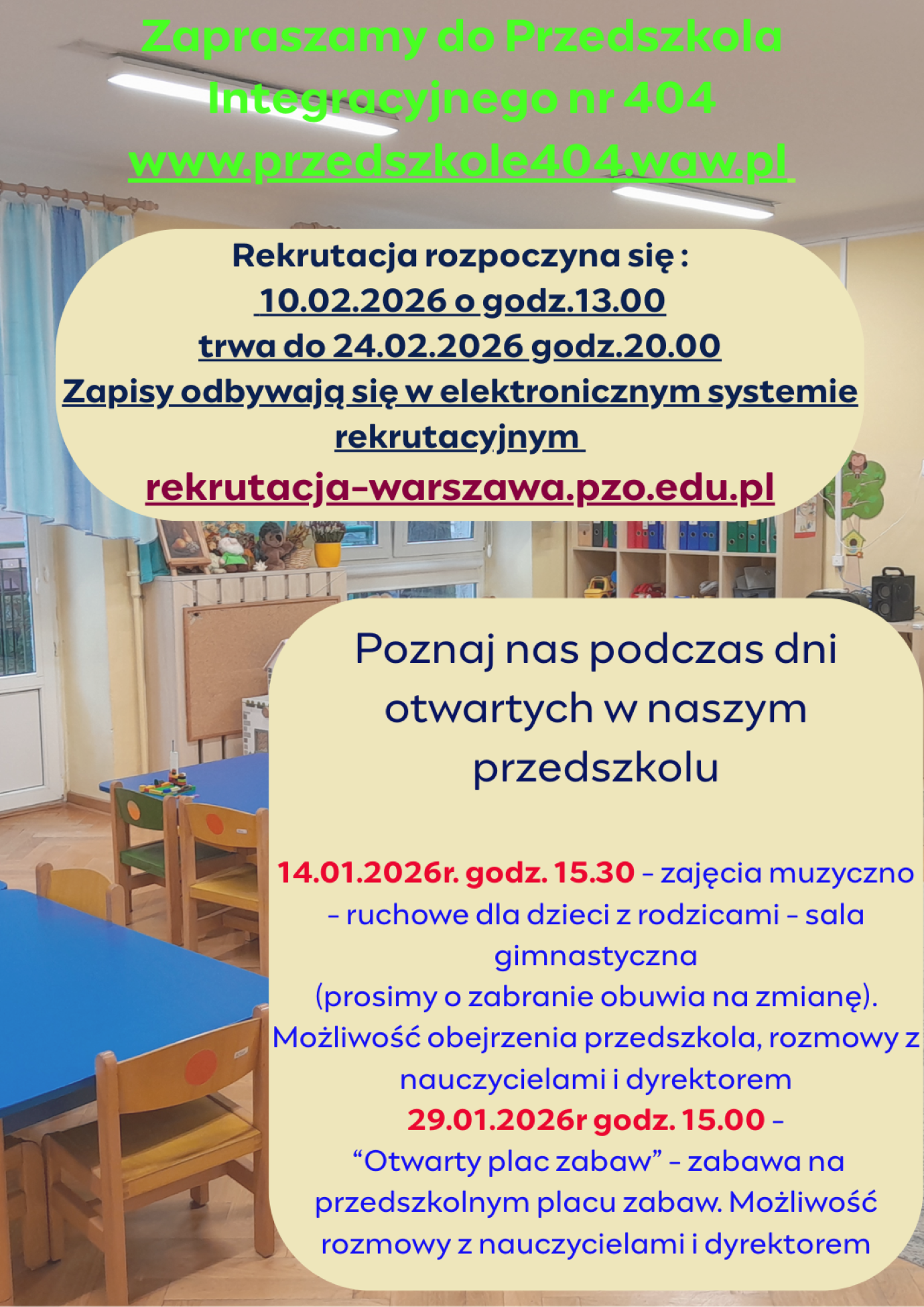 Informacja pod nr tel. 22 822 11 06. Zgłoszenia na adres p404@eduwarszawa.pl oraz osobiście w przedszkolu.
